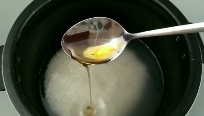 第四步:放半勺香油或一点猪油,这样蒸出来的米饭粒粒晶莹,口感香甜,煮好之后在锅里焖5-10分钟,就可以开吃啦。