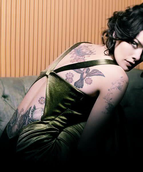 她还有一些小小的嗜好,比如纹身。你能看到从前臂到后背,色彩鲜艳的鸟笼、莲花、牡丹、燕子……各种各样美丽的图案覆盖着她的身体。