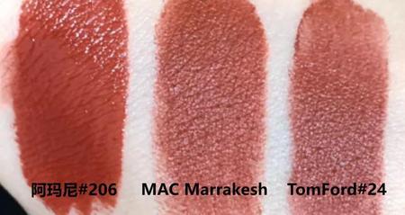 秋冬季节不仅要穿温暖的衣服,妆容也要看起来温暖,而TF的这支陶土色口红非常适合拿来搭配各种暖暖又温柔的橘棕色、咖啡色系眼影。跟大热的MAC子弹头Marrakesh与阿玛尼红管206的上唇颜色效果差不多,阿玛尼206略微偏红一点点,但差别不明显,TF#24与MAC的Marrakesh没区别;从质地上来说,TF#24最顺滑,阿玛尼206更容易粘在牙齿上,Marrakesh上唇最不美好。