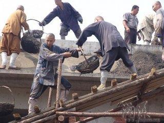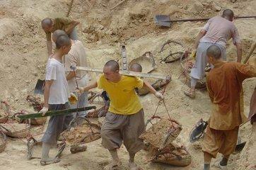 他们不怕脏不怕累,汗水湿透了僧衣。