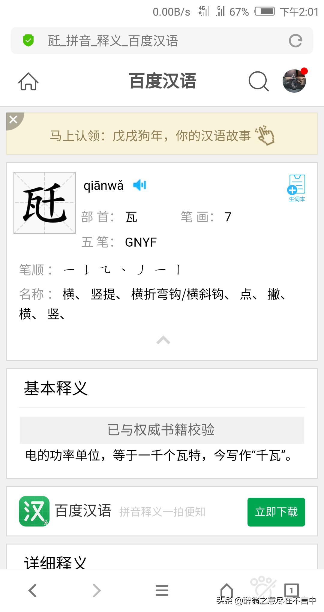 其中有一个字,那就是“瓩”这个字,小岳岳说它读千瓦,原本以为只是开个玩笑,因为中国字大多都是只有一个读音的,而它却叫做千瓦,这么一个字真的读两个音吗?我半信半疑的搜索了一下新华字典,没想到的是还真找到了,手机上也可以搜索得到,正确的读音确实读作千瓦。