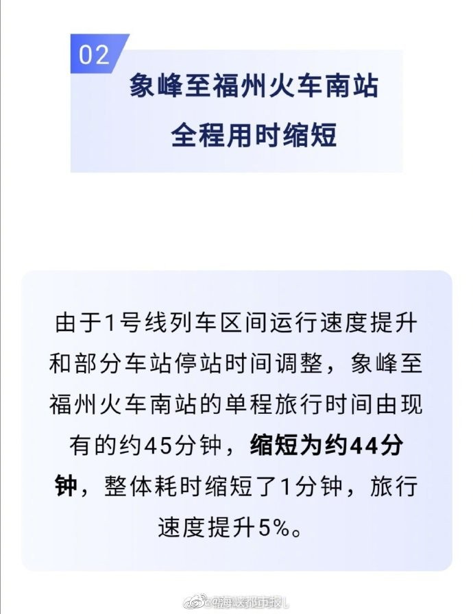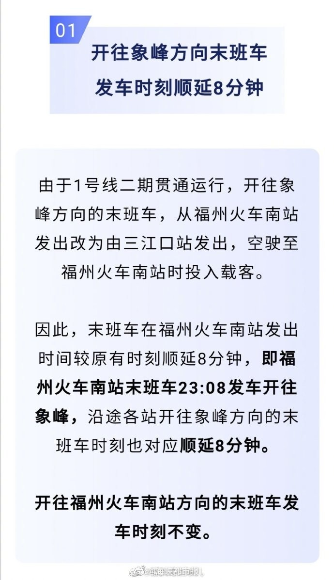 【今起,福州地铁1号线运营时间调整!】10月1日起,福州地铁乘车有变化,1号线一期列车运行时刻表调整,中秋国庆假期加开列车。简单可以概括为往象峰的末班车顺延8分钟,单向全程用时缩短1分钟,首末班车时刻微调。