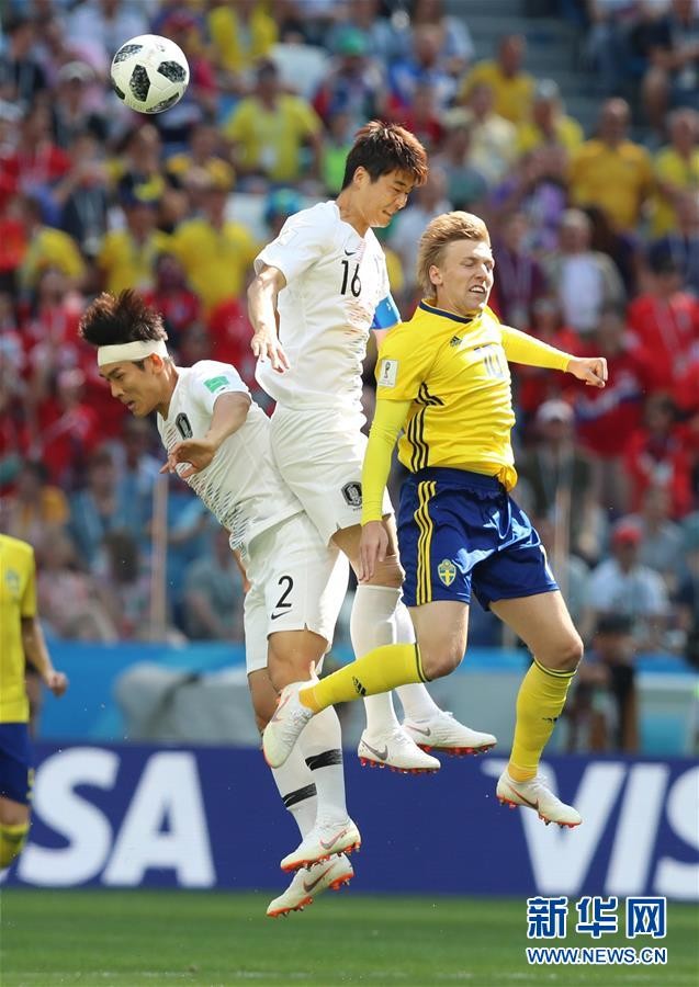 6月18日,瑞典队球员福斯贝里(右)与韩国队球员寄诚庸(中)在比赛中争顶。新华社记者杨磊摄