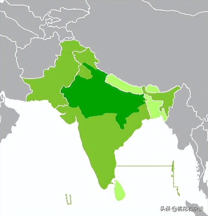 印地语在南亚各地的流行程度,深绿为其完全通用地区