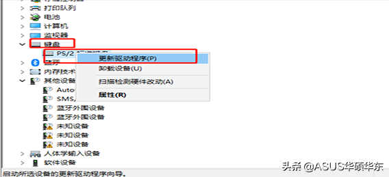 在设备管理器界面,找到“键盘”点击打开,找到“标准键盘”后,选中右键单击,在弹出的菜单中选择“更新驱动程序”就OK了。
