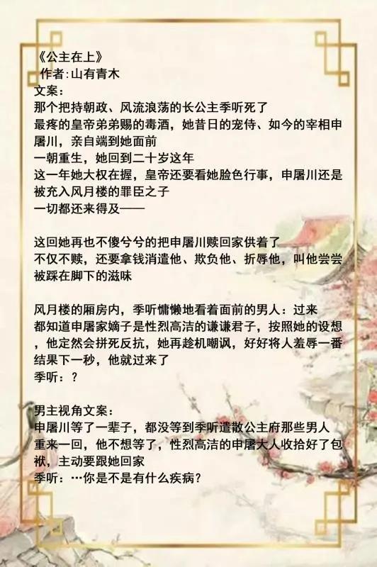 8.《公主在上》又叫《裙下之臣》,高智商公主vs正直高洁权臣,双重生,古言小甜饼,主智商高情商低,在自己家没什么架子,权谋情节也少,就是个甜饼,或许不符合部分小朋友的期望。