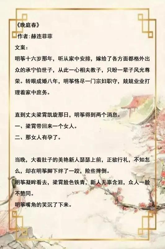 2.《晚庭春》排雷:陆筠是男主;女主非c男主c;古言环境,女主没有超越自身时代的先进思想。女主人设很赞,男主人间痴情,默默暗恋女主好多年,最终守得云开见月明,两人终成眷属。很甜。