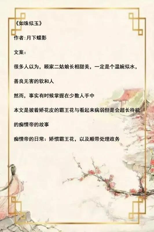 4.《如珠似玉》月下蝶影的文都轻松风,喜欢里面的晋鞅,看似温文尔雅,其实内里十分冷漠无情,直到女主出现,久久就像是照亮他道路上的晨光,无人能及,超甜。