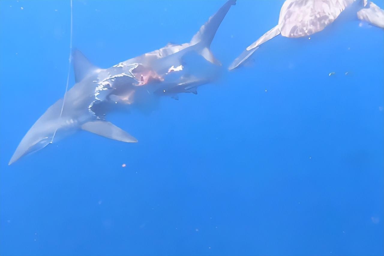 从视频里面来看,这条鲨鱼基本上没有什么生存的可能性了,半边身子都好像没有了,居然还能慢悠悠游回深海,这不是僵尸是什么?