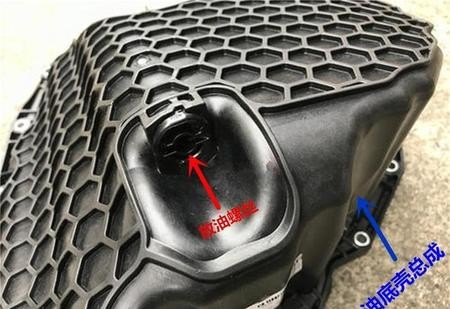 当然,大众旗下还有些车型在每次更换机油时最好还是把放油螺丝更换掉为好,譬如,辉昂、奥迪A6这两款车,因为这两款车的油底壳和放油螺丝既不是铁制的也不是铝制的,而是塑料材质制成的(如下图所示),塑料材质的油底壳和放油螺丝在发动机产生的高温下很容易发生变形,而变形后油底壳和放油螺丝衔接处就会出现漏油的情况,漏油严重时还会给发动机造成一定的损伤,所以购买这两款车的车主在更换机油时最好还是将放油螺丝更换掉,进而避免给自己带来不必要的损失。
