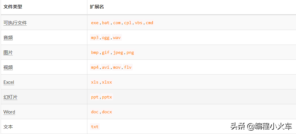 一般看到扩展名就可以知道文件类型,下表是常见的文件类型对应的常用扩展名: