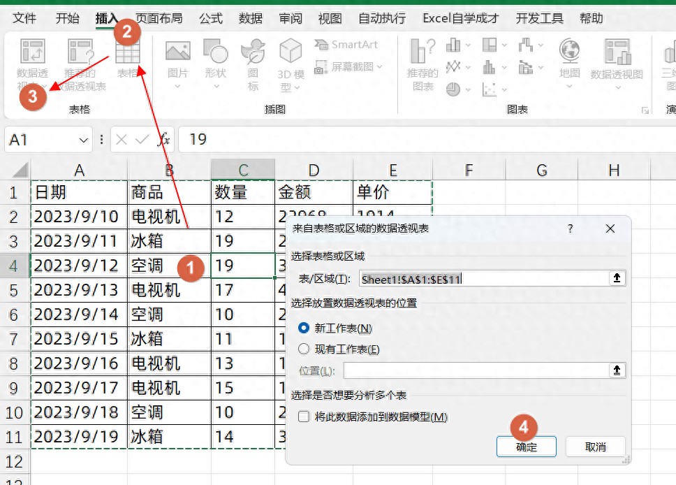 我们选中数据区域任意一个单元格,然后插入数据透视表