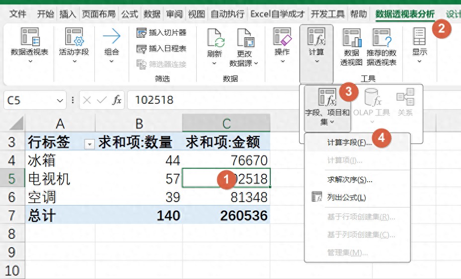 我们需要在数据透视表的分析窗口,点击字段,项目和集,然后选择计算字段