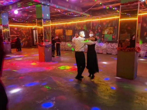 傍晚7点多,二十多个舞友拎着装舞鞋的包如约而至,赶赴这场久违的舞会。室外温度零下二十摄氏度,他们寒暄着坐在卡座上脱掉厚厚的棉鞋,换上皮鞋,几位女士还郑重其事地穿了长裙,每个人脸上戴着口罩,看不清表情。灯光音乐一起,他们旋入了舞池。