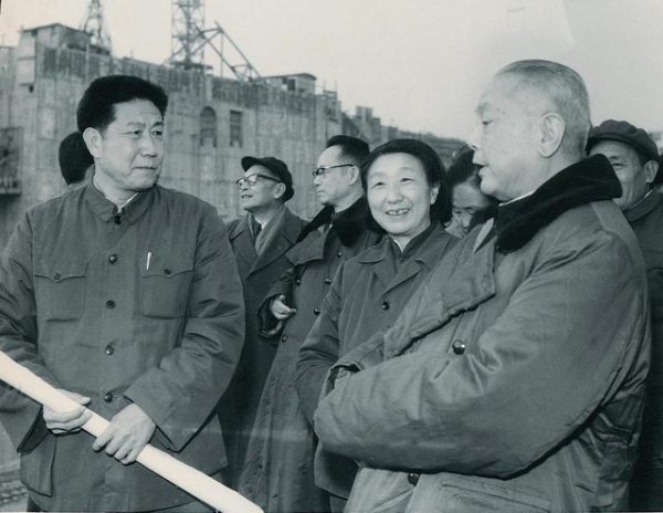 1978年1月,钱正英同志(前右二)陪同李先念同志和谷牧同志视察长江葛洲坝工程建设。新华社发