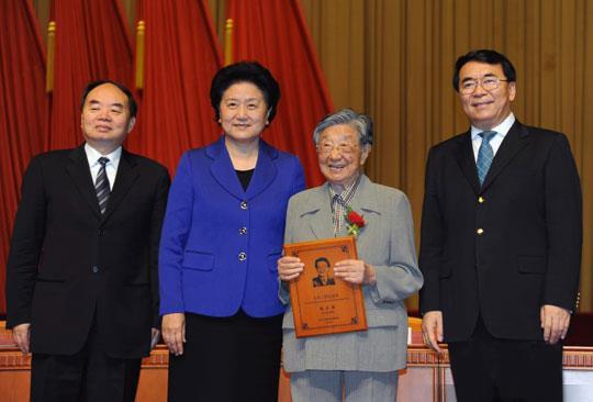 2014年6月,钱正英同志(右二)出席在北京举行的中国科学院第十七次院士大会、中国工程院第十二次院士大会,荣获第十届光华工程科技奖成就奖。新华社发