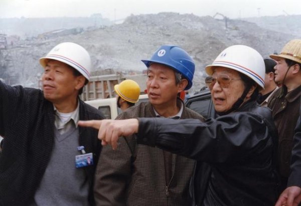 2002年11月,钱正英同志(前右)率国务院三峡工程建设委员会质量检查专家组深入三峡建设工地检查工程质量情况。新华社发