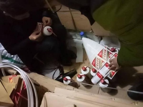 瓶盖、丝带和瓶冒套好后,加热瓶身,使瓶冒和瓶完全咬合。然后贴上茅台商标和防伪标签,包装2箱12瓶成品假冒茅台,用时不到20分钟。据澎湃新闻报道,曾拿着在仁怀市兴盛路组装的假冒茅台酒,在遵义一家茅台专营店进行检测。肉眼可以以假乱真,但没能通过店内检验机的检测,扫描结果显示没有查询到该假酒的任何信息。
