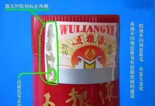 黄色标签正面有个激光标,真酒中央有个五粮液标识,而假酒也有,不过偏下了。