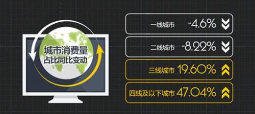 瓜子二手车大数据分析结果显示,三四线城市二手车消费量增长势头明显,是拉动消费增长的主力。同比去年,一线城市及二线城市均表现下跌,但仍然是二手车消费的主力市场;三线城市消费量占比由16%增长至19.13%,并极为接近一线城市消费量,增幅达19.6%;四线及以下城市增幅更加明显,高达47.04%。三线及四线及以下城市市场崛起且潜力巨大。