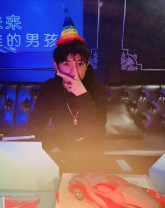 只见王源头戴生日帽,面前放着一个超跑的造型蛋糕,对着镜头伸出一个胜利的手势。