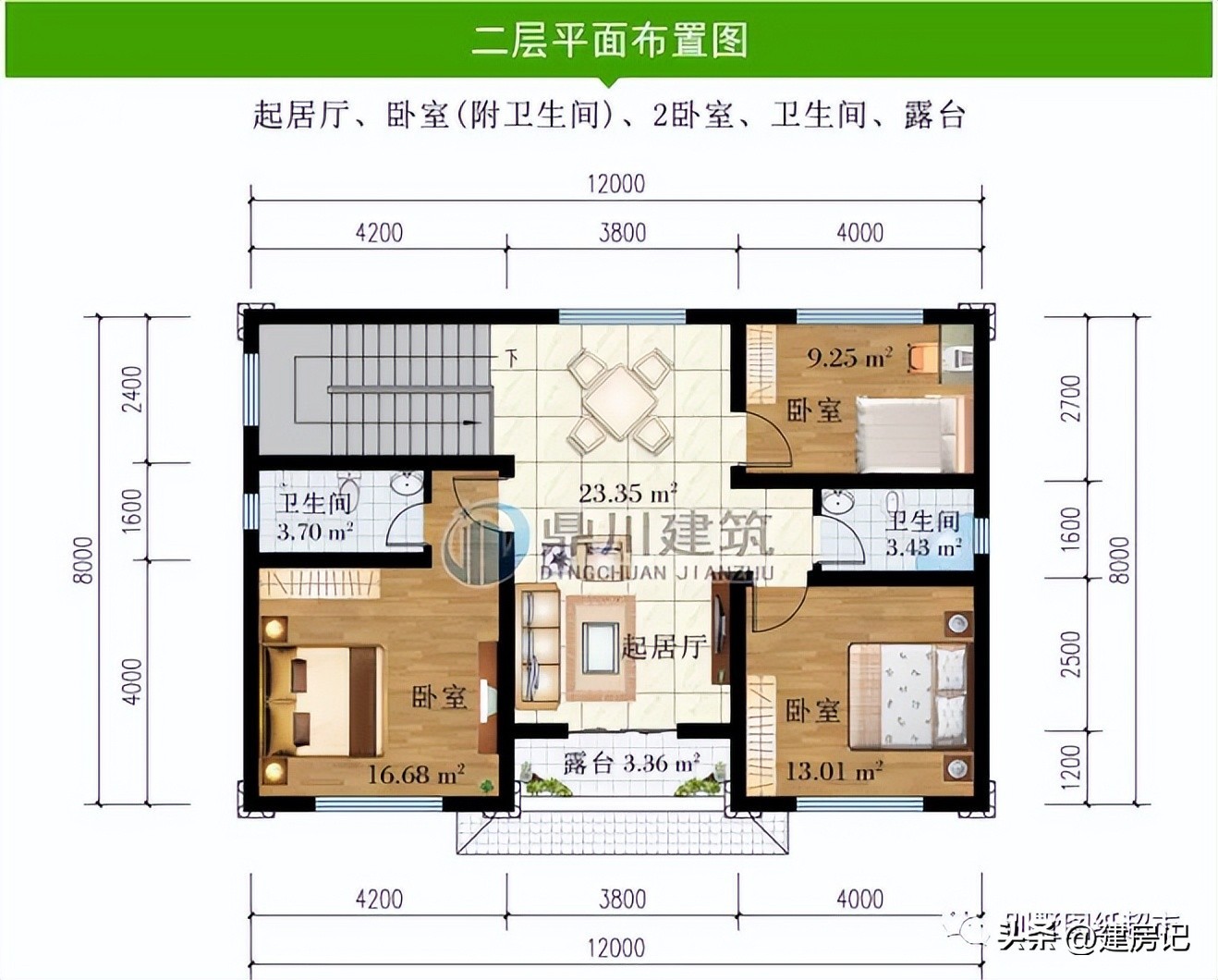 二 层:起居厅、2卧室、卫生间、露台