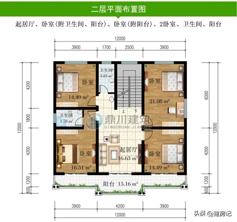 二 层:起居厅、卧室(附卫生间、阳台)、卧室(附阳台)、2卧室、卫生间、阳台