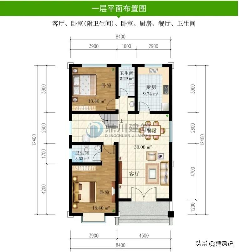 一 层:客厅、卧室(附卫生间)、卧室、厨房、餐厅、卫生间